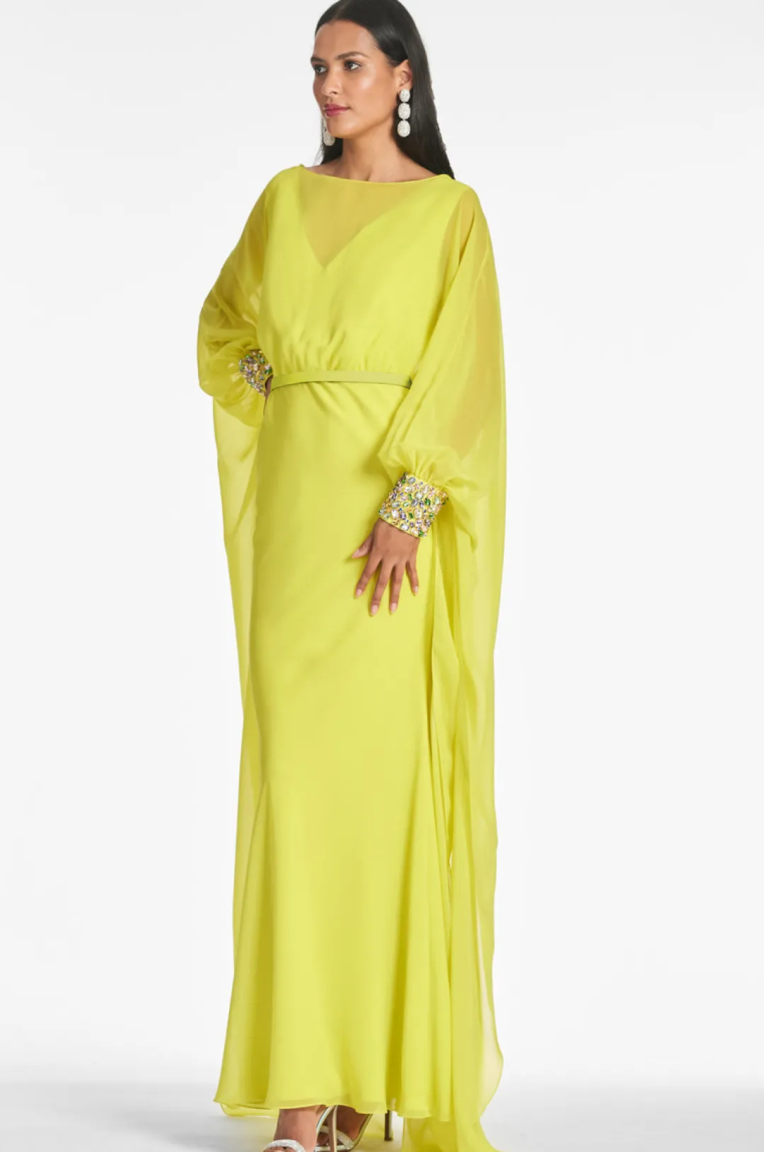 If you’re looking to turn heads, you’ve come to the right place. The Aphrodite gown in neon limeade is solid chiffon with perfectly placed multicolor gems on each cuff. Featuring dramatic sleeves and a waist cinch, she’s all about the drama, keeping fit and sophistication at the forefront.