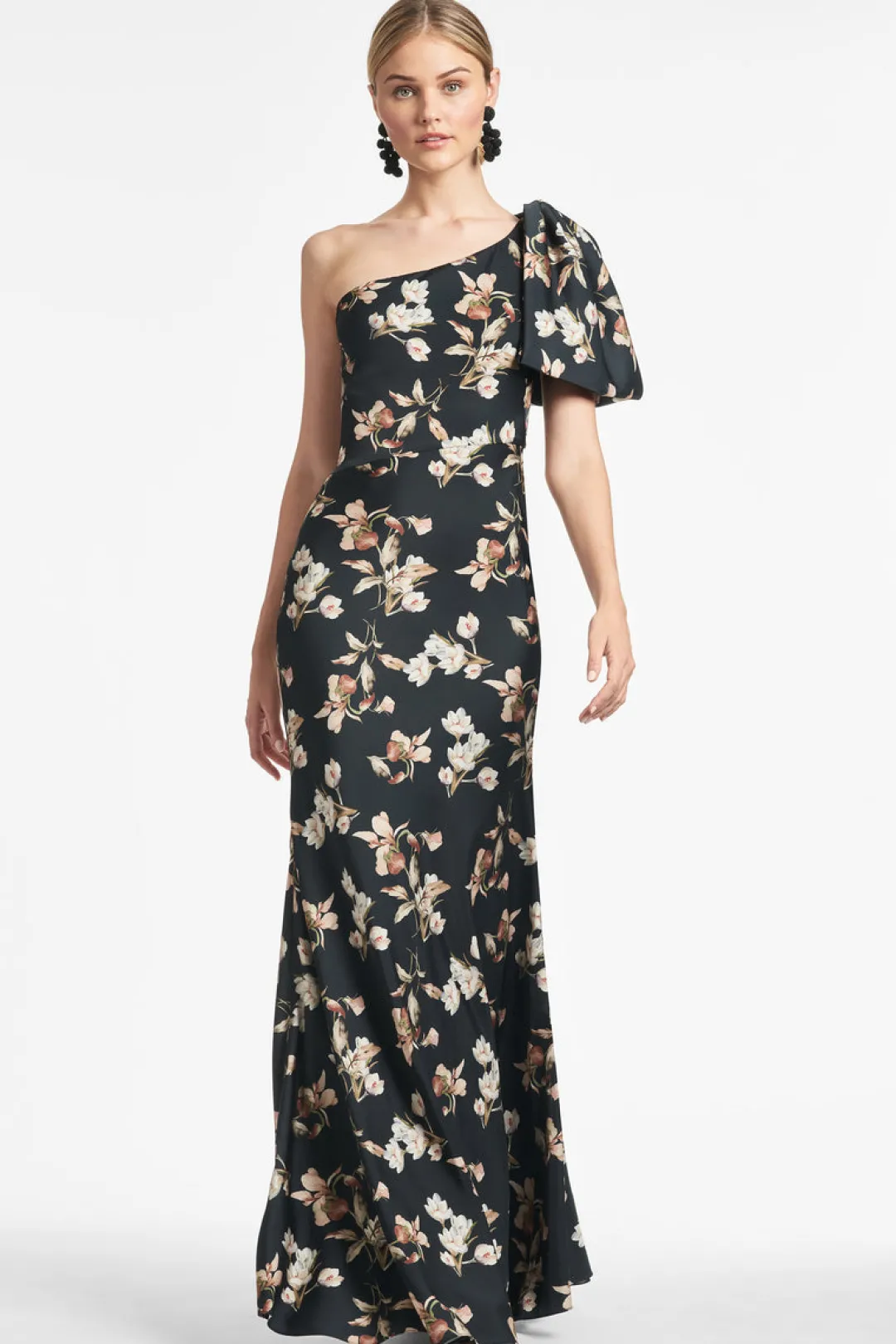 The Aubrey gown in black venetia petal print is an example of balance by design. A sleek sleeve of charmeuse cut on the bias with an asymmetric seam at the waist creates a column for curves. At the shoulder sits a hand tucked collapsed bow adorned with hand-embroidered silver caviar beading at the knot.