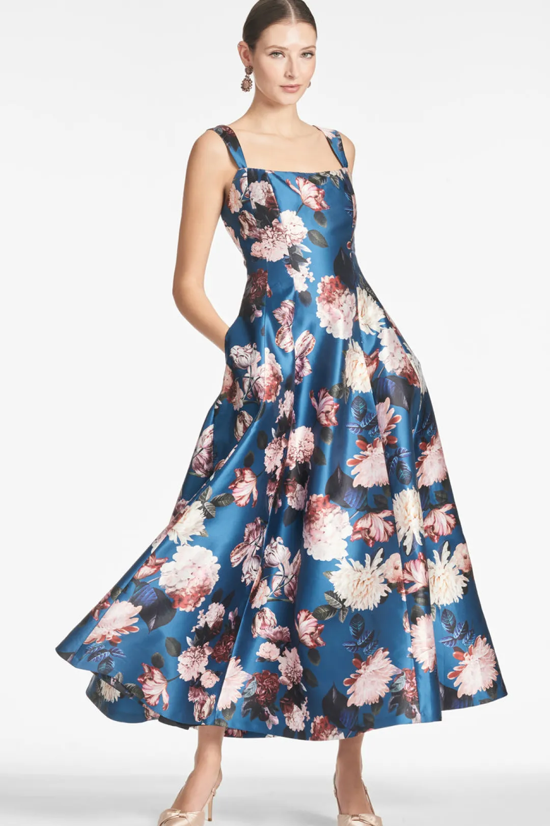 A classic simply put. Audrey is what was once referred to as a party dress before cocktail dresses became the common term. Her silhouette is an elegant fit and flare, and the neckline is a softly squared scoop. The fabric is what heirlooms are made of, the dress that no one forgets and is inevitably passed down. Featured in floral Mikado, it is nothing less than luxurious, the sweep of the skirt dramatic but flattering, and at back a discreet bow is the final detail to complete the dress.