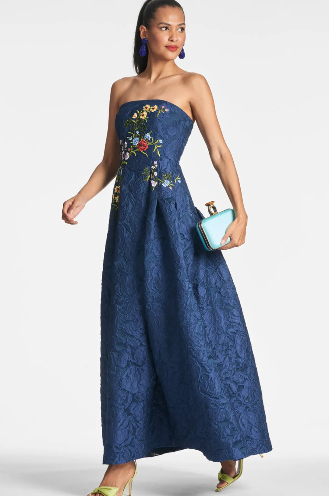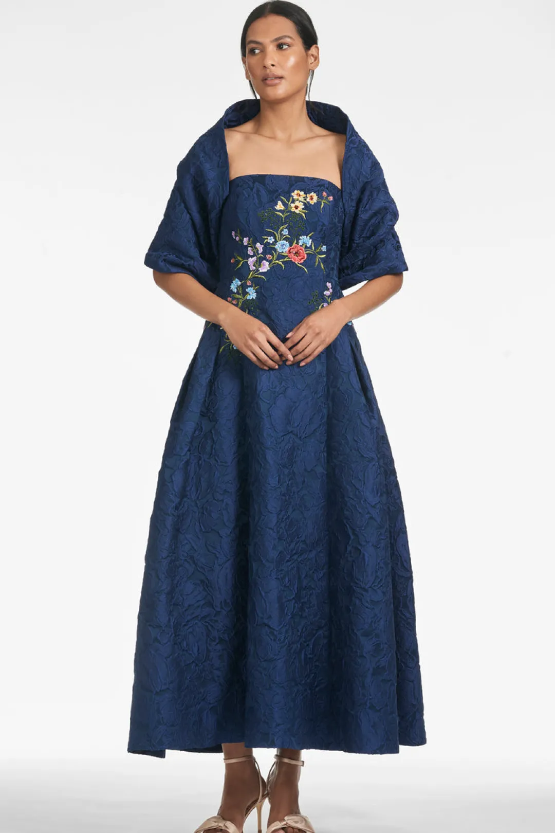 Meet Belle, the ball gown of your dreams. She’s made of striking blue lace fabric with multi-color floral embroidery on the fitted bodice and a pleated A-line skirt. This is delicate, sophisticated, and sure to make an entrance.