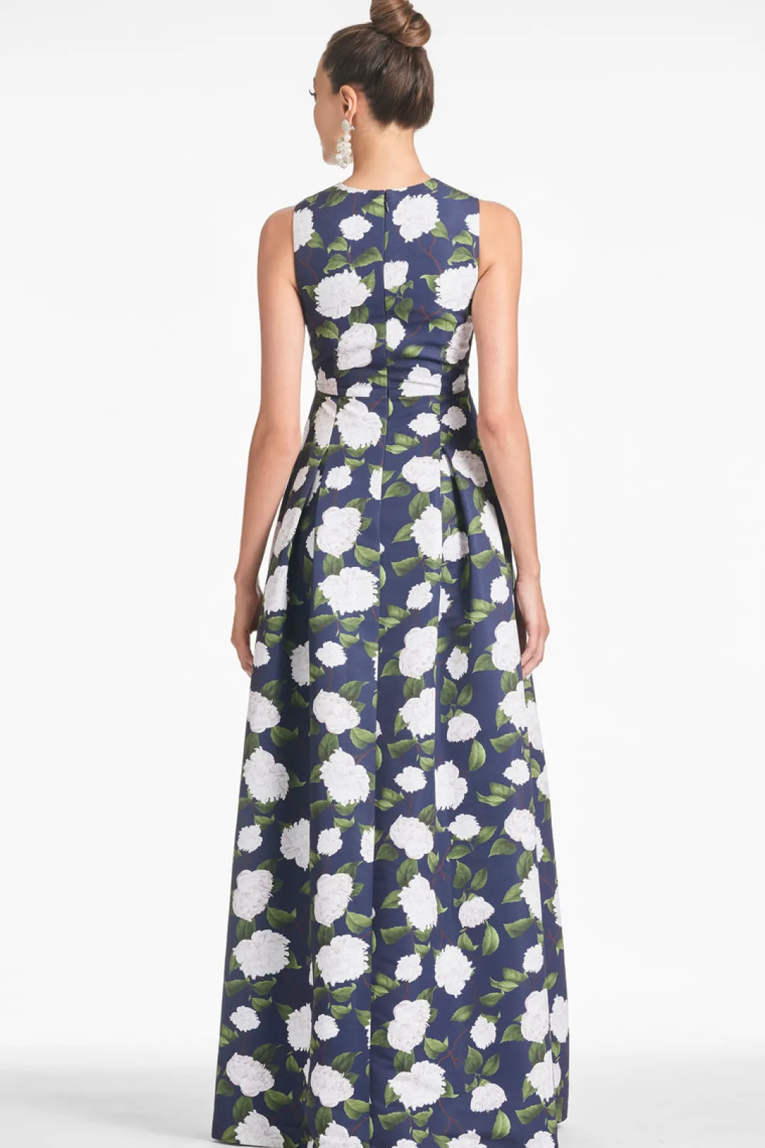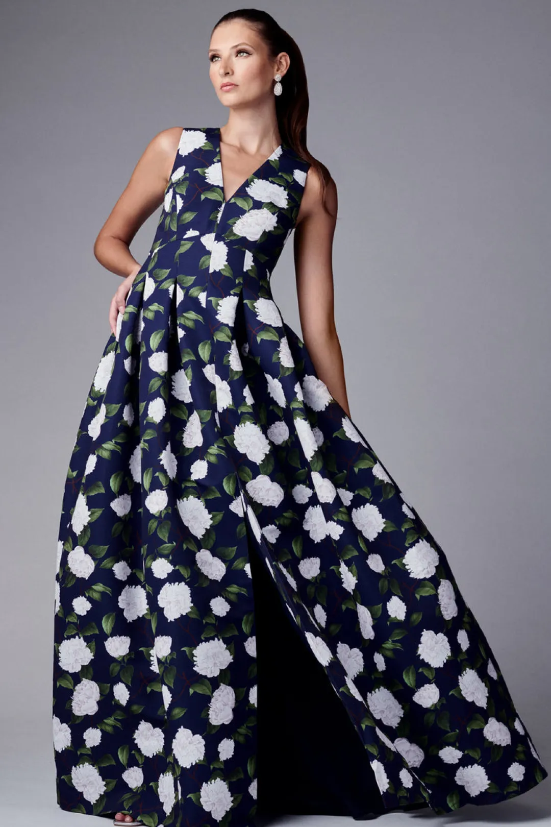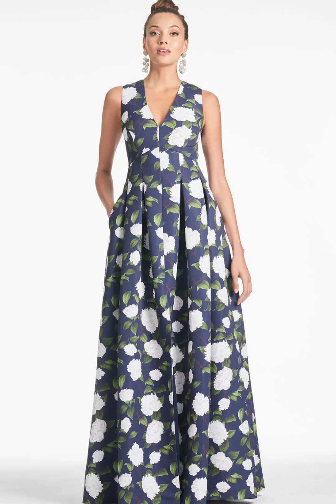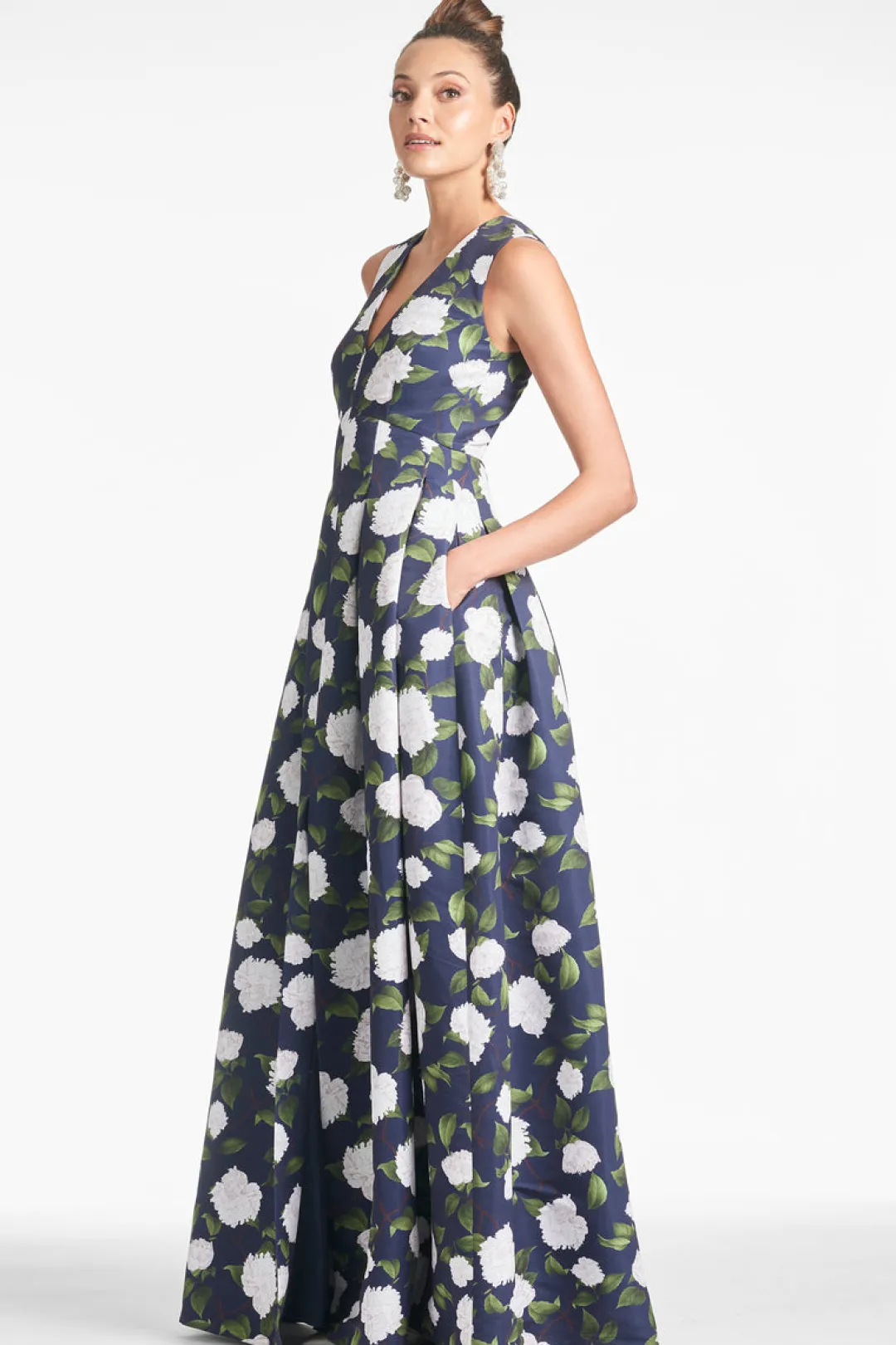 The Brooke is our V-neck gown with box pleats, peaked waist seam, and side pockets. This dress is what we consider to be a classic, essential silhouette, a perfect canvas for our most breathtaking prints. This one is featured in Navy Moonlit Garden, our peony print with gorgeous touches of green and ivory.
