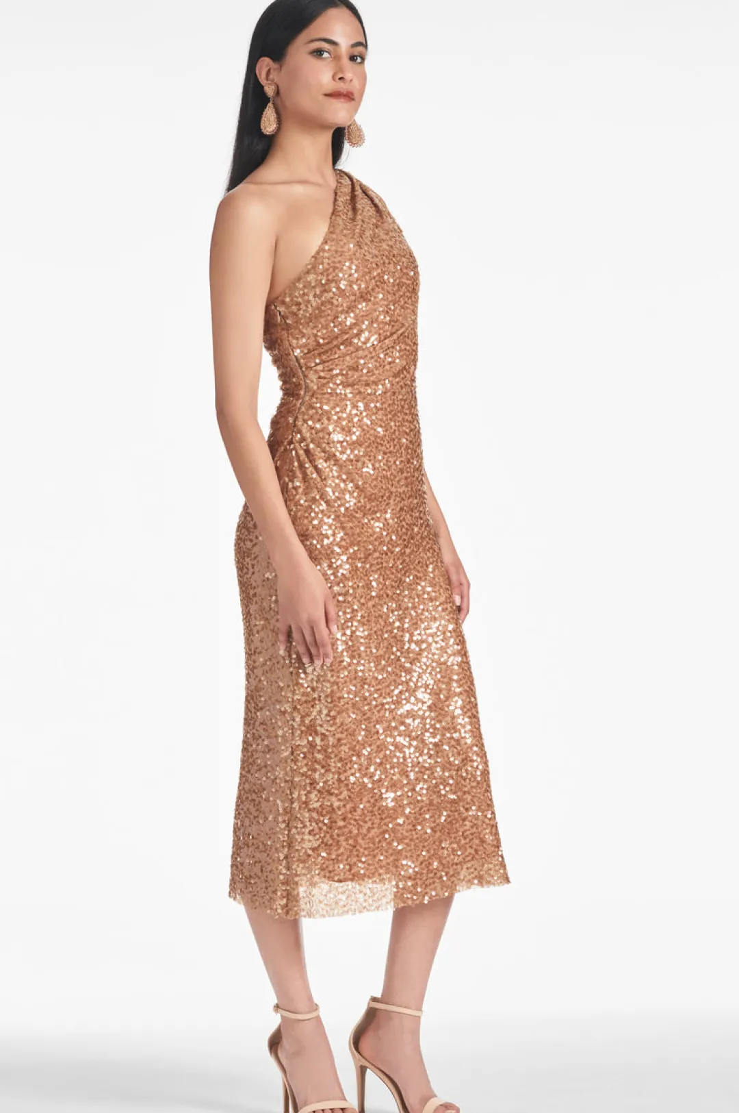 Look and feel amazing in the Carmen Dress! This one shoulder design sparkles in a beautiful honey, making it a perfect choice for any fun or festive occasion. The mid-length honey hued dress in stretch sequin fabric ensures a comfortable and stylish fit – you’ll love the confident feeling you get while wearing it!