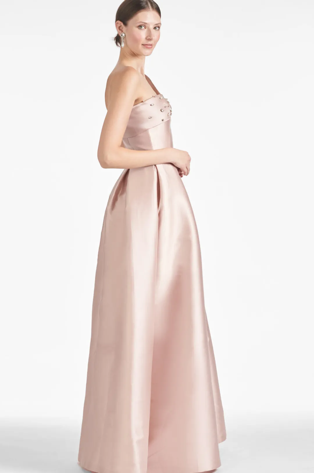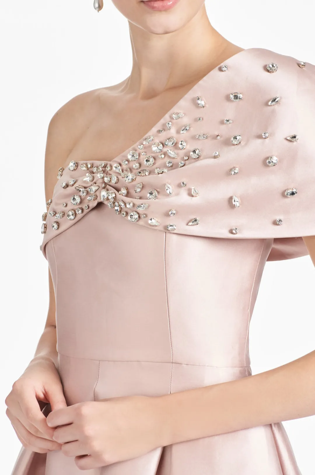 One of our newest black-tie dresses is the Delilah. Her inspiration quite frankly was our customers, we took elements from our most beloved gowns and combined them to create her. The one shoulder, the twist at the bodice, the clean waist, and the full skirt with slash pockets and center front slit.