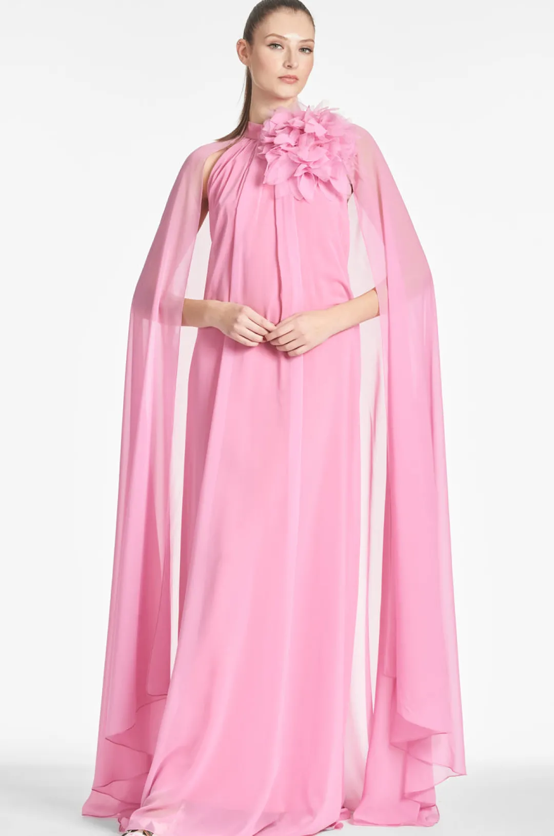 Helena is made for the girl who wants to turn heads. This chiffon gown in the sweetest candy pink shade features a floral neck detail and sleeves that form a cape on either side. She’s lightweight and romantic, making her the perfect pick for your next warm-weather event.