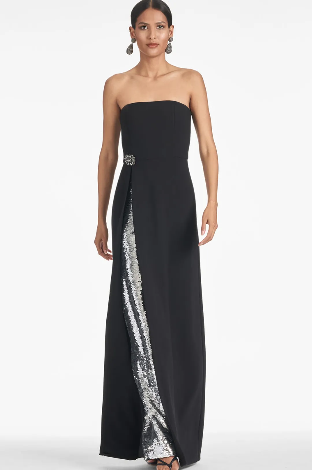 A sleek, strapless design in classic black is elevated with a hidden layer of shimmering silver sequin, adding a bold touch of sparkle to the piece. A timeless statement, be the envy of the party in the Ivy Gown.