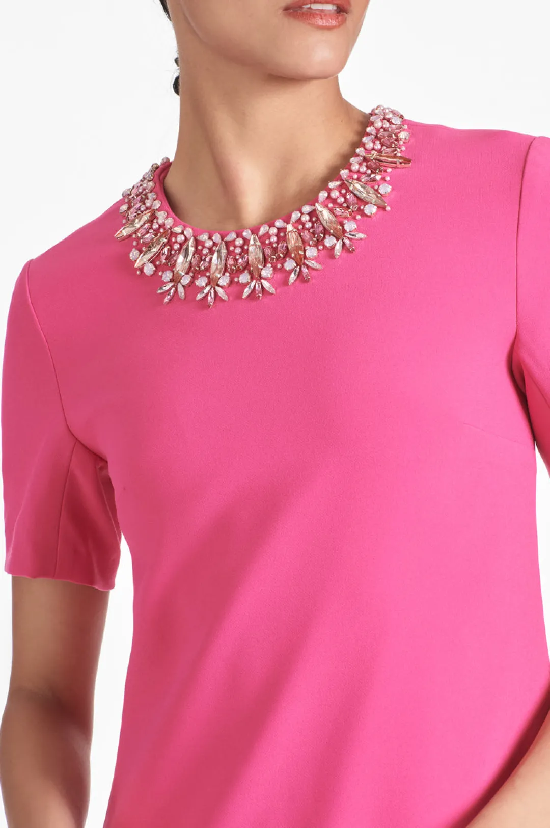 The Lauren Dress is a perfect staple. Its rose pink color and short sleeve design make it ideal for day to night transition. The mini dress features an embellished neckline which adds a sophisticated touch, wearable for any occasion. A must-have for any wardrobe, this dress is delicate, feminine, and flattering.