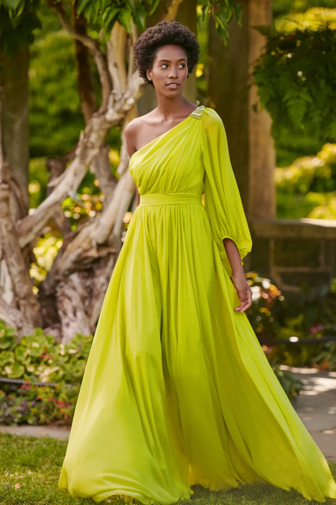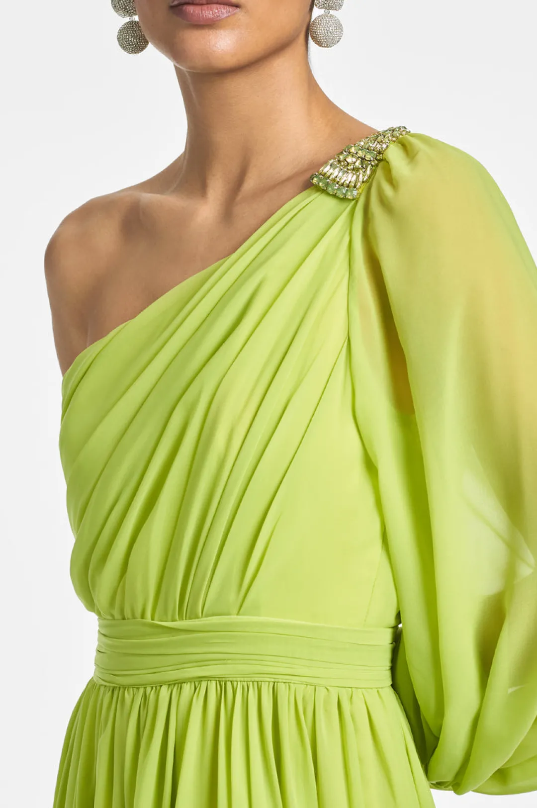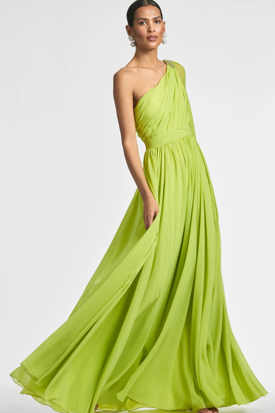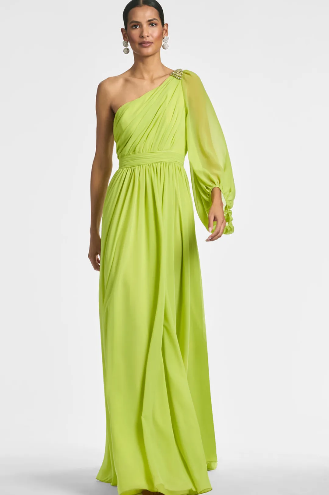Make a statement in our Makayla Gown. Featuring a one-shoulder design and diagonal rouching at the bodice with a banded waist, this stunning chartreuse gown is perfect for any special occasion. The crystal-embellished broach adds a touch of glamour to complete the look.