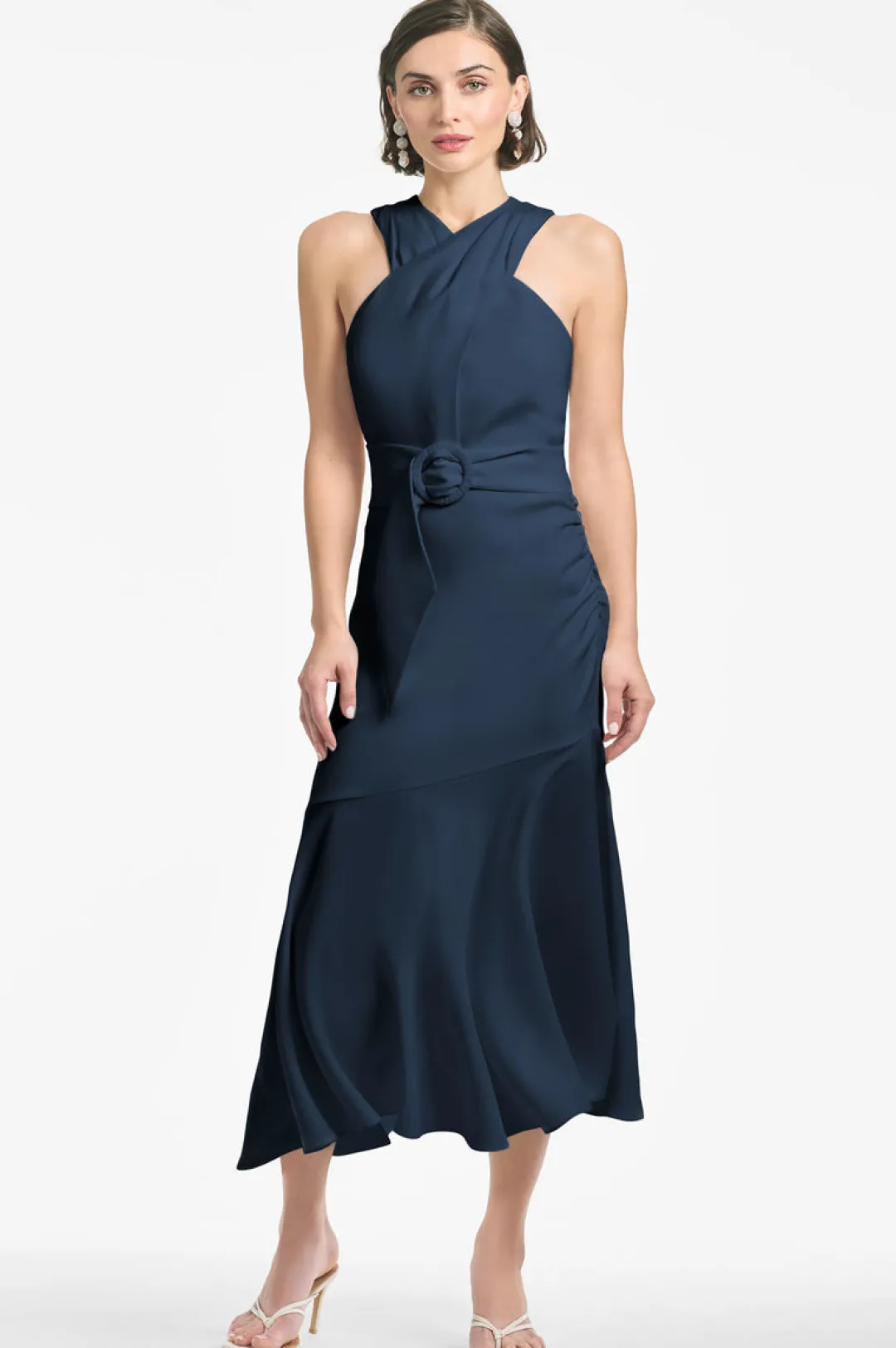 The Naomi dress in crepe is a modified mermaid silhouette in Midnight. The halter neckline opens up the decolletage creating a subtly elegant silhouette, ruching is also seen at the side to hug the hip, falling away from the body with a fluid asymmetric hem. The bodice features a self-belt with hand-wrapped buckle.