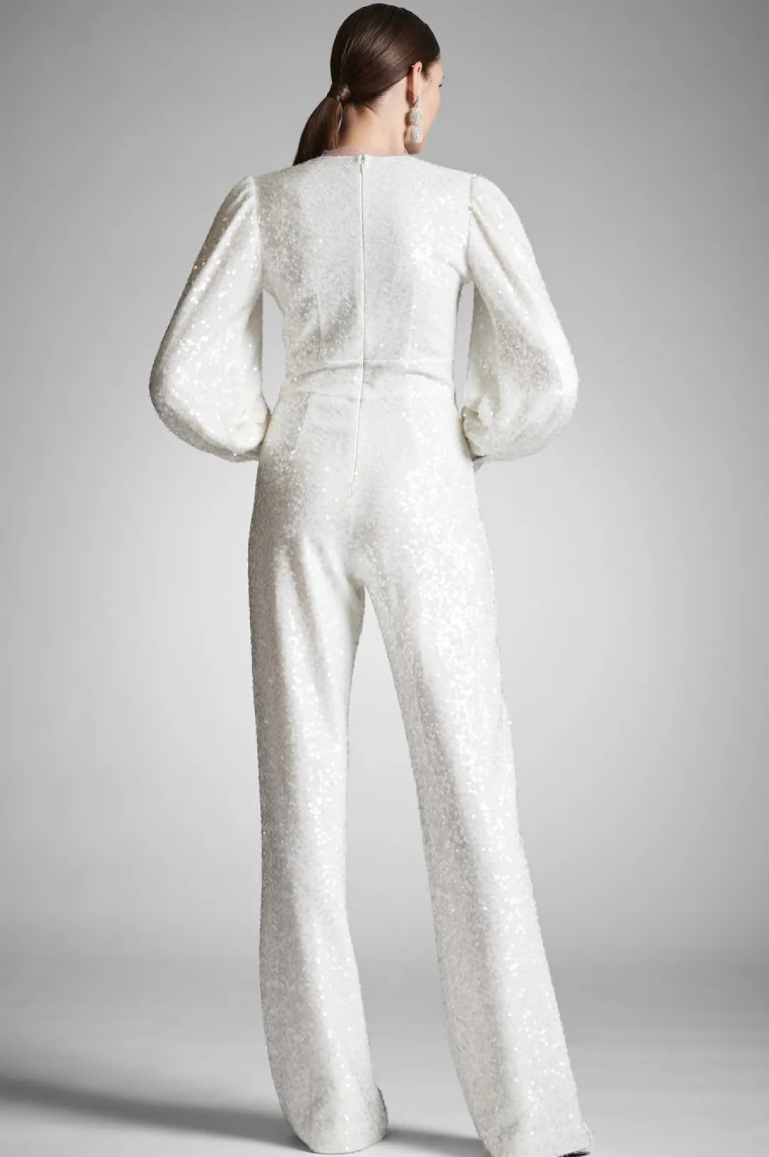 The Presley Jumpsuit is the perfect choice for the bride who wants to shine, this second-look outfit shimmers with every move. Crafted with ivory sequins, this jumpsuit will dazzle on the dance floor. The sophisticated design is ideal for the modern dancing queen to make a statement on your special day.