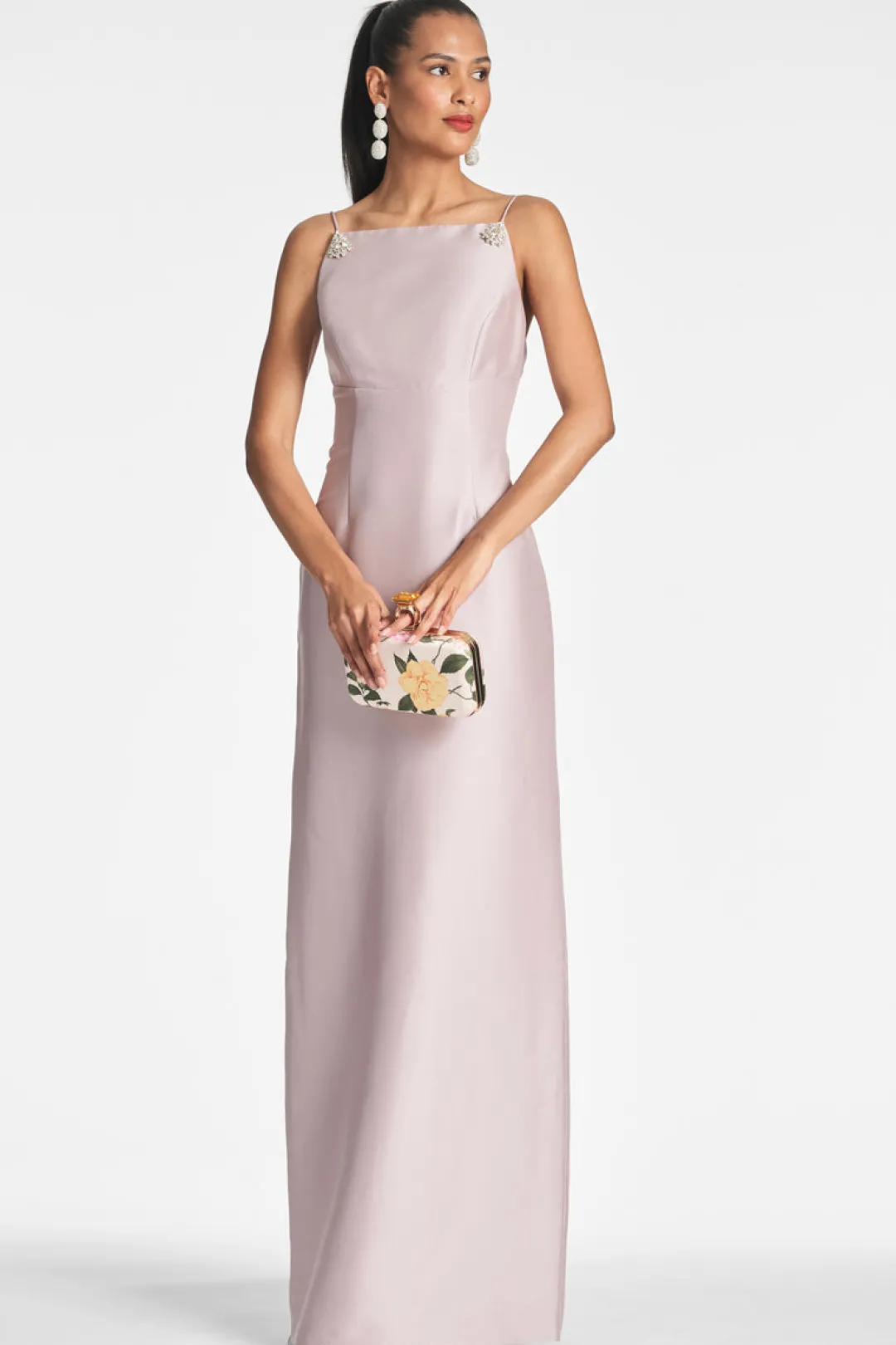 Sometimes the best answer is the most simple one, and that is true for the Pryce gown. A stunning column dress in stretch Mikado, she’s delicately adorned with crystal clips in a stunning shade of blush.