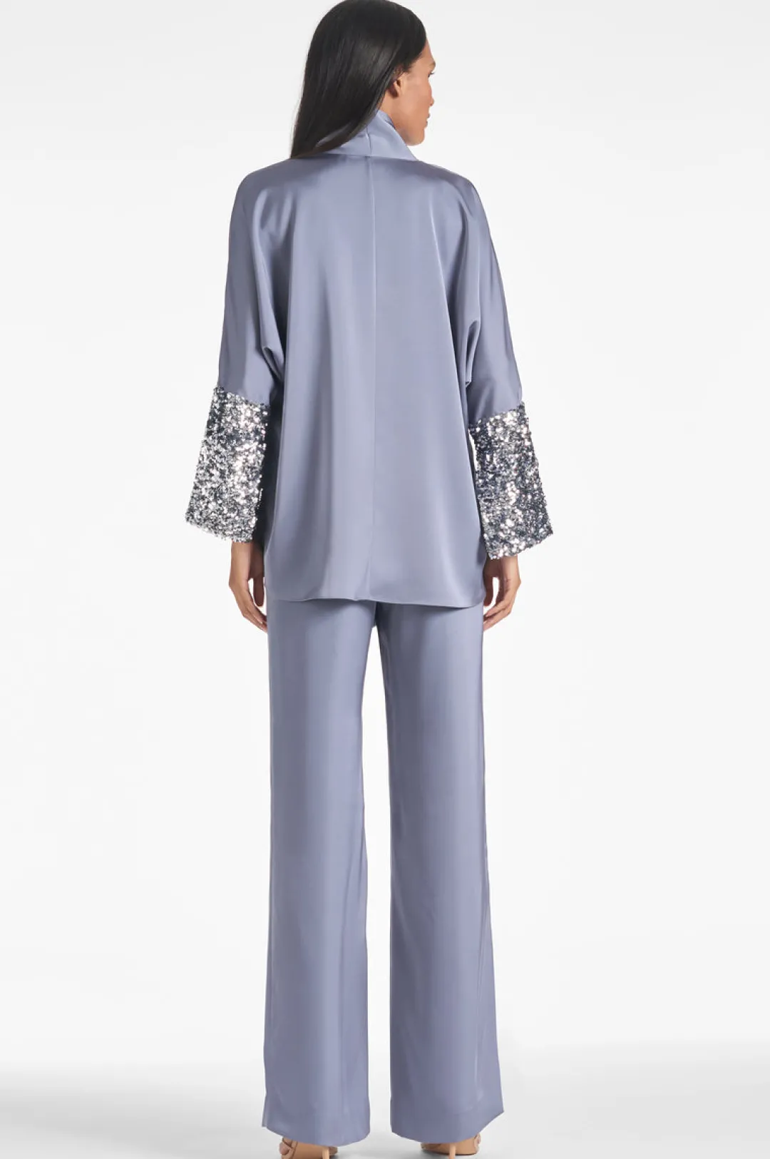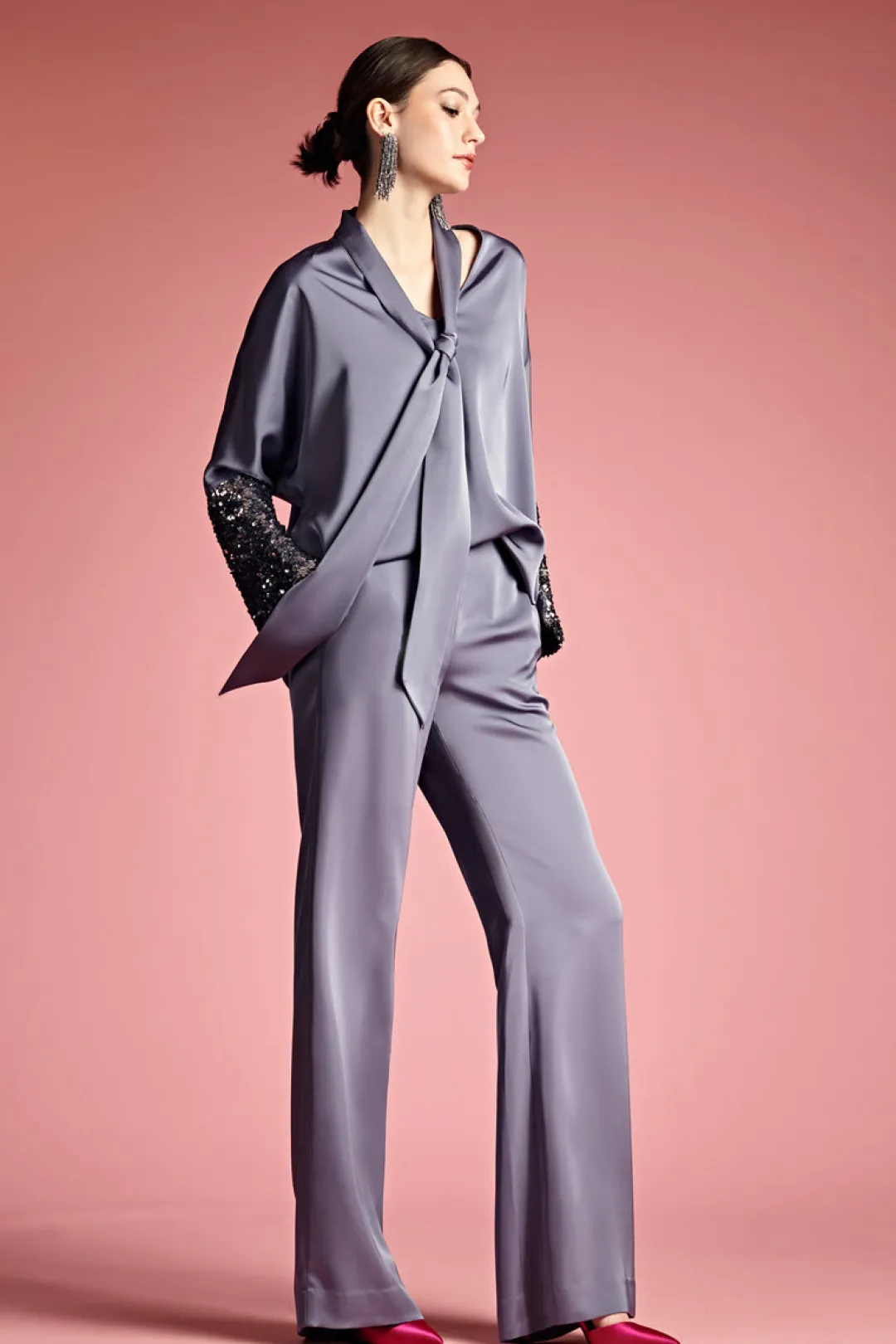 The Reid Top is a stylish, easy-to-wear, relaxed fit statement piece. The cool grey hue makes it perfect for any time of day, from a day at the office to a night out, with a self tie at the neckline and sequin detailing on the sleeve to add that extra shine, Reid is a standout. Pair back to the matching Bri pants or with your favorite jeans or leather.