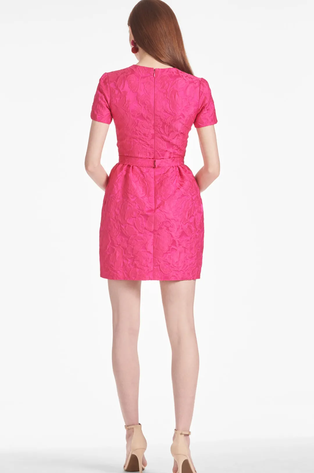 The Rue Dress is perfect for any season. Crafted from pink cloque, this mini dress has short sleeves and a belted waist. It’s the perfect cute look for work, dinner, or a party, and can be styled in many different ways.