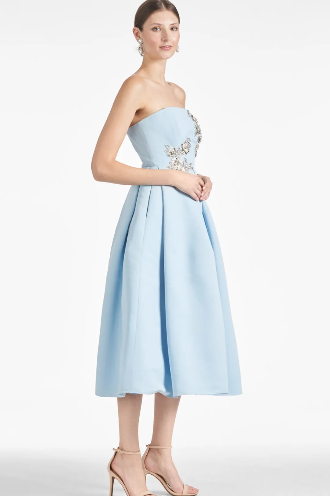 The Sydney Gown is a strapless, tea-length dress in a beautiful, perfect blue. Embellished with subtle sparkle detail, this sweet dress is sure to make you feel so special that you won’t want to take her off.