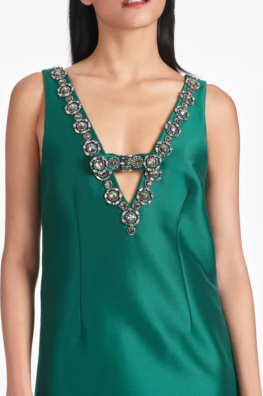Make a statement in our glamorous Sylvie Dress. This sleeveless mini with sparkling embellished medallions down the center front is the perfect party ensemble. Featured in our stretch Mikado this cocktail dress is one that will stay in your closet for seasons to come!