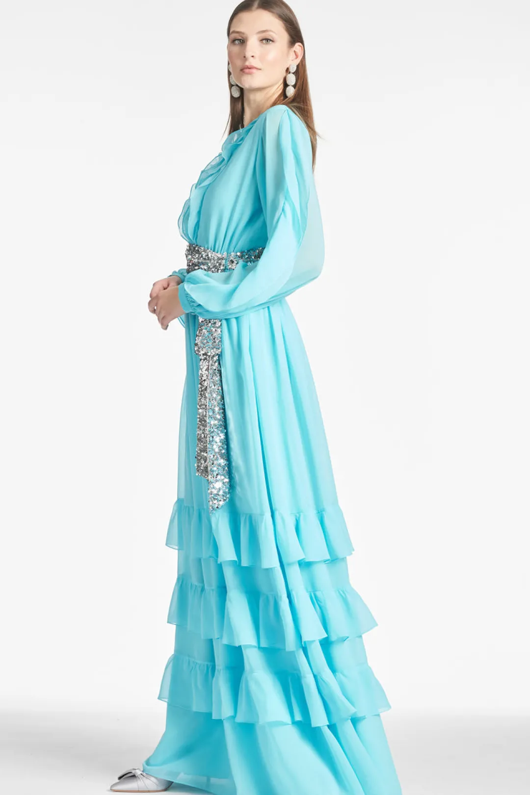 Prepare to make a statement in the Venus Gown in blue topaz. This solid chiffon piece is elegant yet modern, sophisticated yet flirty. She features sheer bubble sleeves, embellished front buttons with ruffles, and a self-tie silver sequin belt.