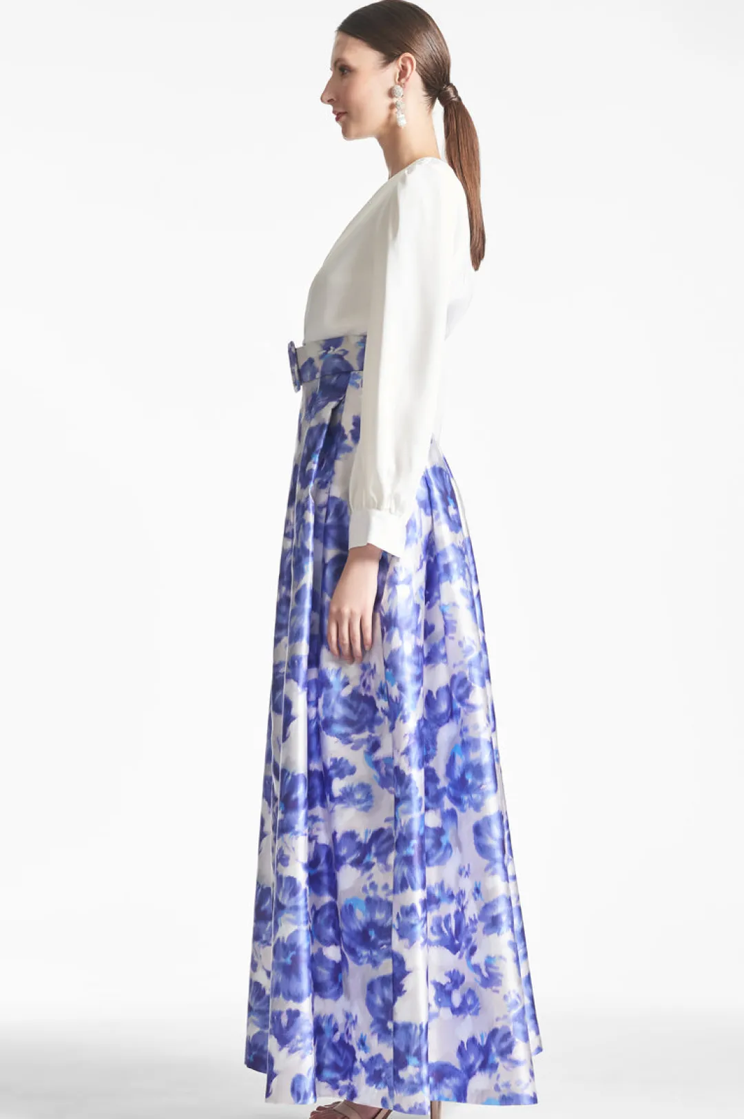 The Zoe Gown is the “Grande Dame” of the occasion. The deep V-neck off-white satin crepe bodice meets the printed Mikado self-belt to join the classic ball skirt with its soft, box pleating. At the front a discreet, but still dramatic, front slit and at each side a side slit pockets.