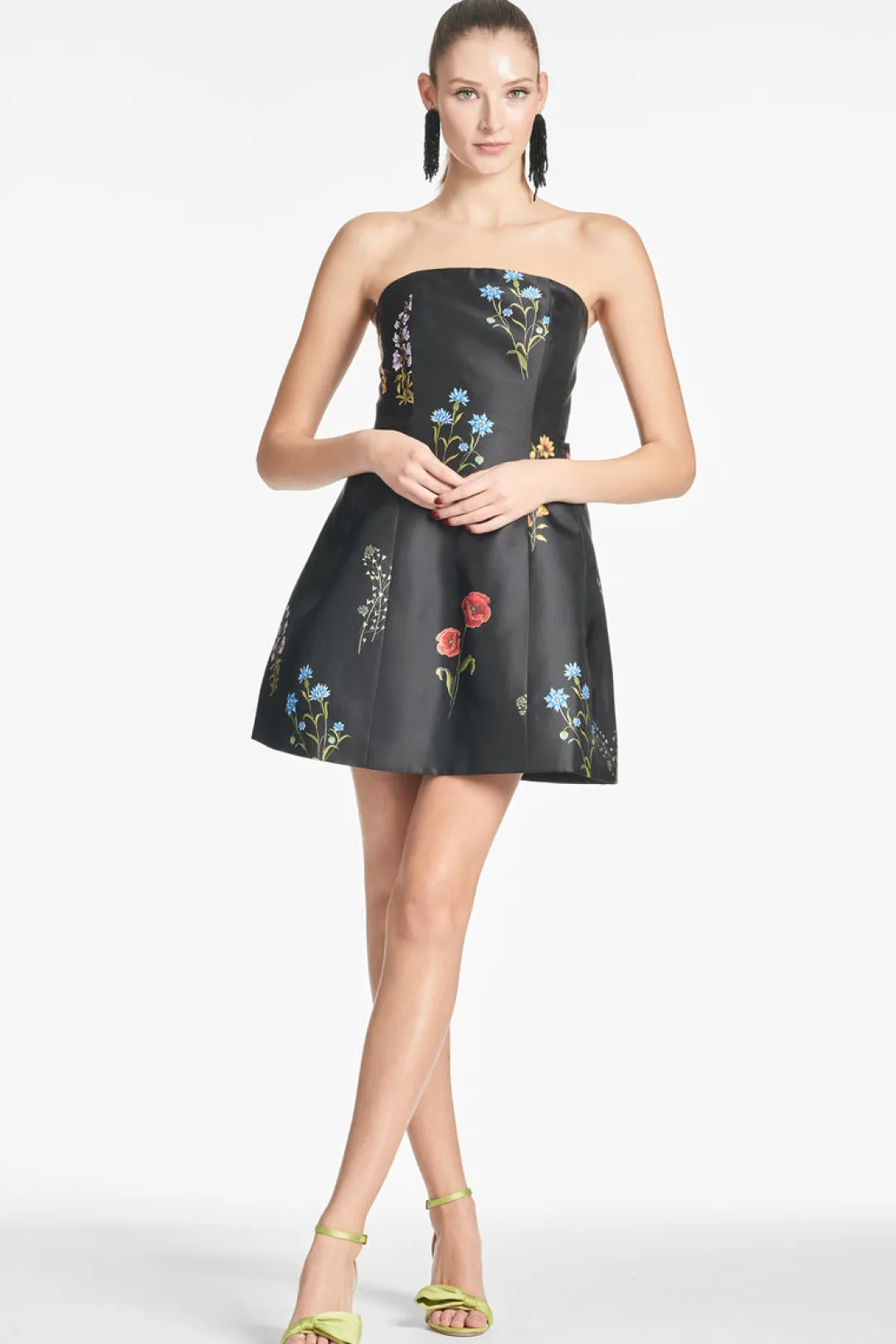 She is a sculpture articulated in our noir bouquet floral print! This ultimate strapless mini dress is engineered to keep her perfect bell shape. Boning at the bodice is what allows her to defy gravity. Embroidered flowers kiss the top of the dress disappearing into the bodice. We spent many hours on this frock to make sure she is exactly what you see on the site.