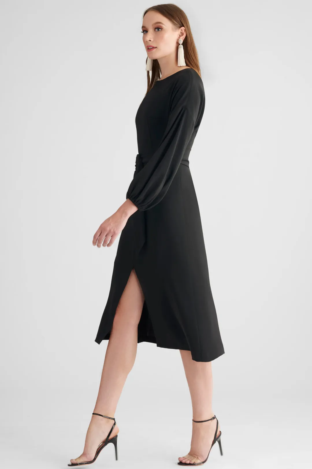 If ever there was a dress that could go anywhere it is Annie. The clean lines of this chic sheath are punctuated by an elegant and understated bracelet sleeve ruched at the cuff to create a subtle volume, center front slit, and self-sash. The lightweight crepe drapes elegantly and is considered an ideal 3 season fabric.