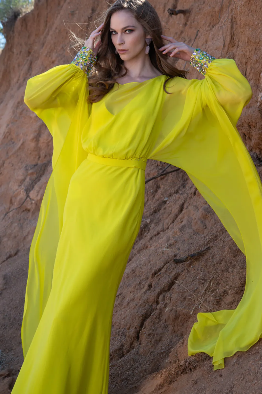 If you’re looking to turn heads, you’ve come to the right place. The Aphrodite gown in neon limeade is solid chiffon with perfectly placed multicolor gems on each cuff. Featuring dramatic sleeves and a waist cinch, she’s all about the drama, keeping fit and sophistication at the forefront.