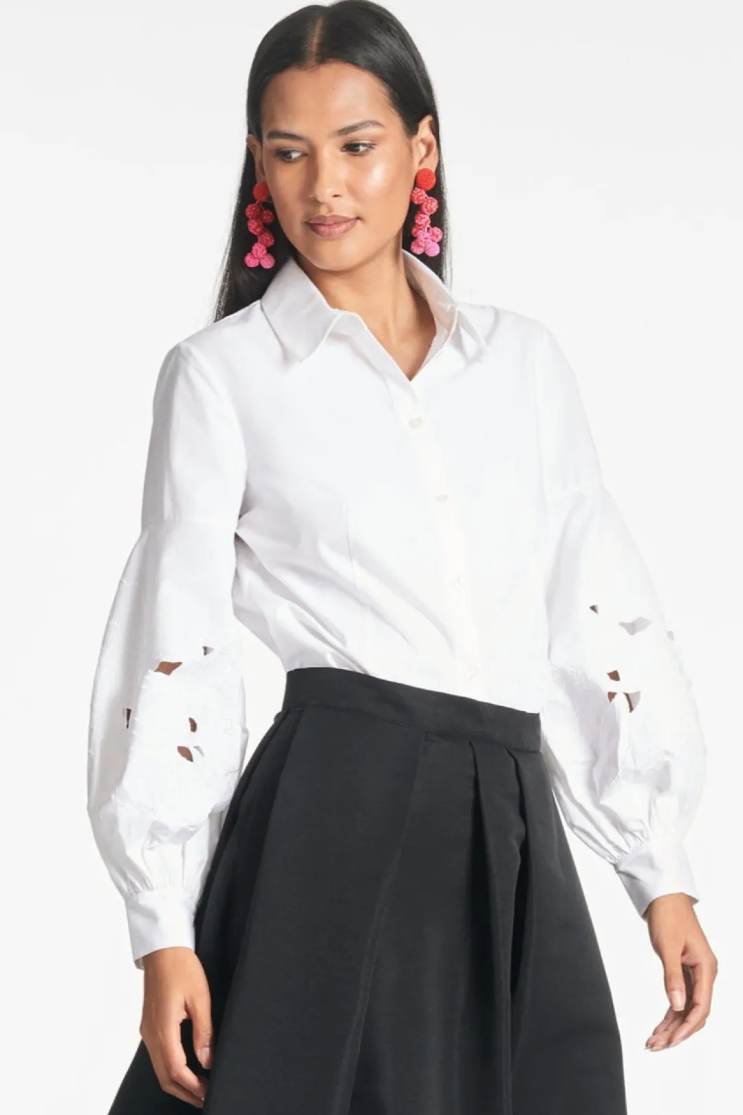 The Astor Top is a fashion essential that adds a unique touch to any wardrobe. It features an elegant, dramatic embroidered sleeve and princess seams for a flattering and refined fit. Its classic collar creates a timeless style that looks great for any occasion, and a romantic alternative to basic blouse.