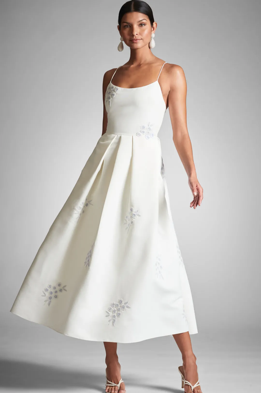 Audra is elegant and of another time, this ballerina style dress reminds of us pink champagne and pearls. In an understated, yet sophisticated faille, the tea-length dress with soft box pleating is adorned with a floral embroidery.