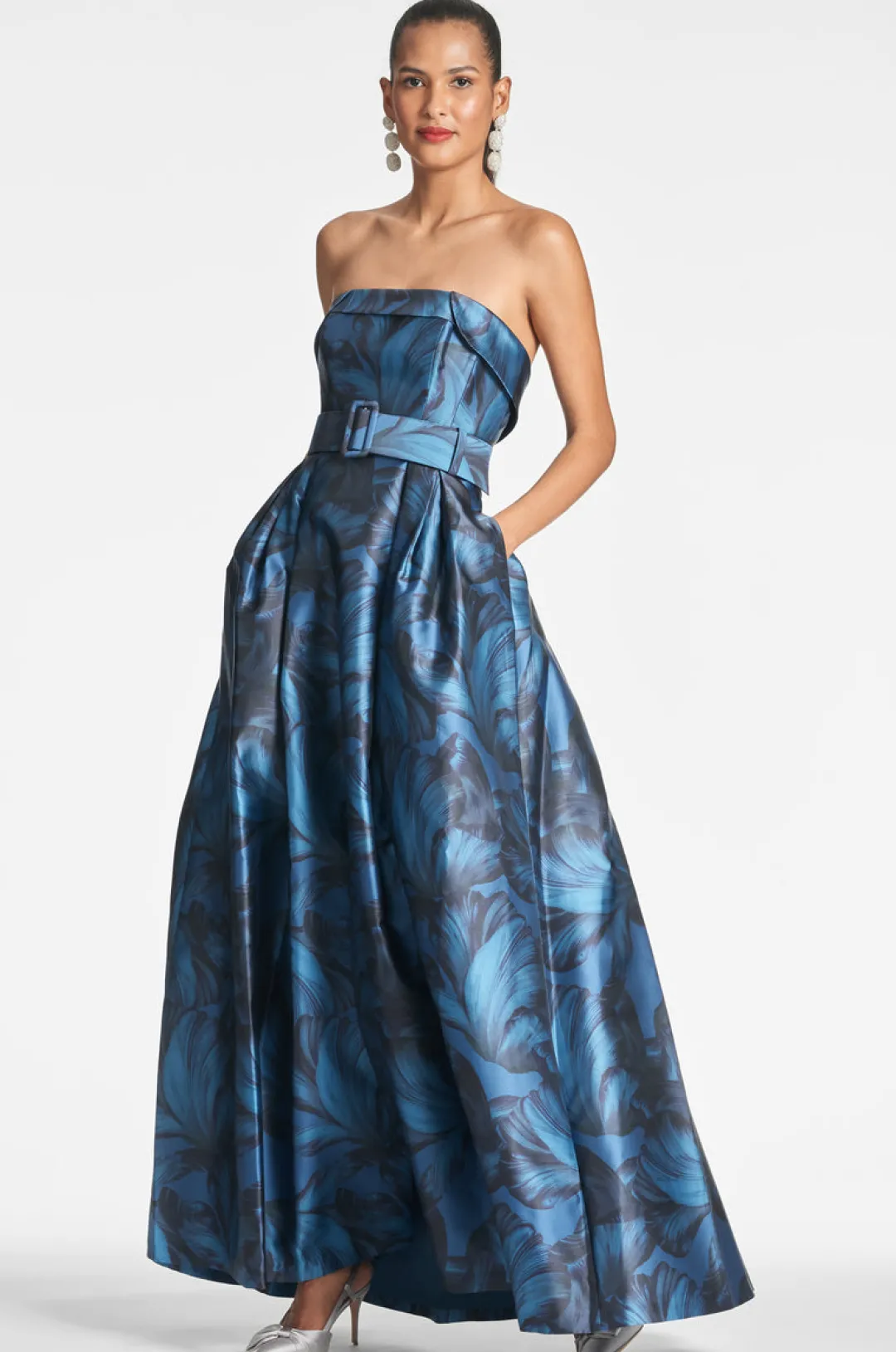 The Brielle gown is a vision in our uniquely romantic tonal petal print. The otherwise classic strapless silhouette has a specially designed envelope fold to add a bit of architectural interest.