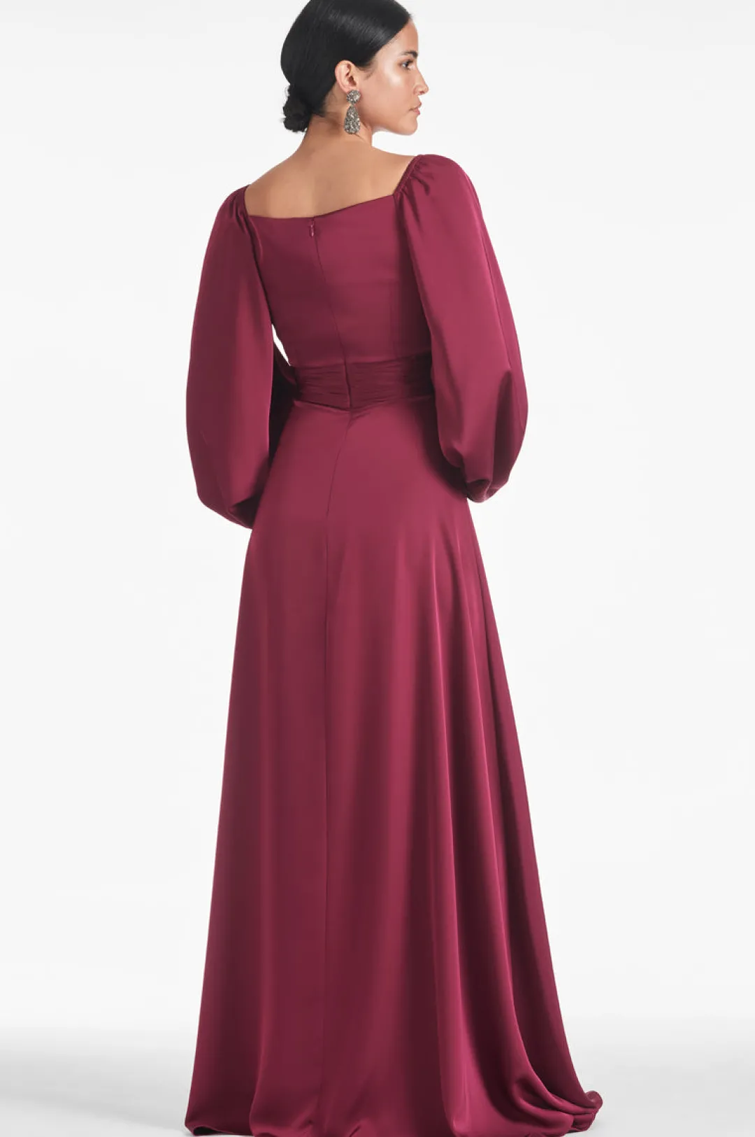 The Bryant gown is imagined in a satin crepe, a fabric well known for offering a sophisticated more modest shine. The shape of the gown is easy and elegant, perfect for the VIP of any special event. The square neckline cuts just below the clavicle, and the sleeve has elastic to allow you to wear it both on and off the shoulder. In the end, this is a gown for all seasons, in a color that sits perfectly in any garden or is the jewel in winter.