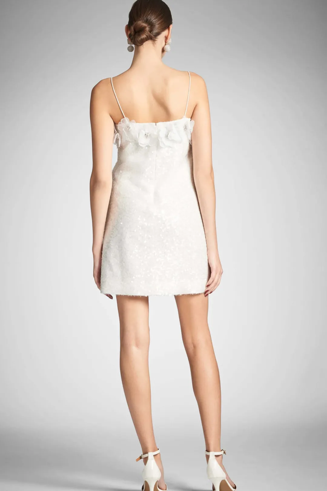 Dasha is for the bride looking for something special. She features all-over white sequins with embellished organza flowers lining the top. These hand worked details are even more magical in person. This one may be a mini, but she’s maxing out on fun and sparkle.