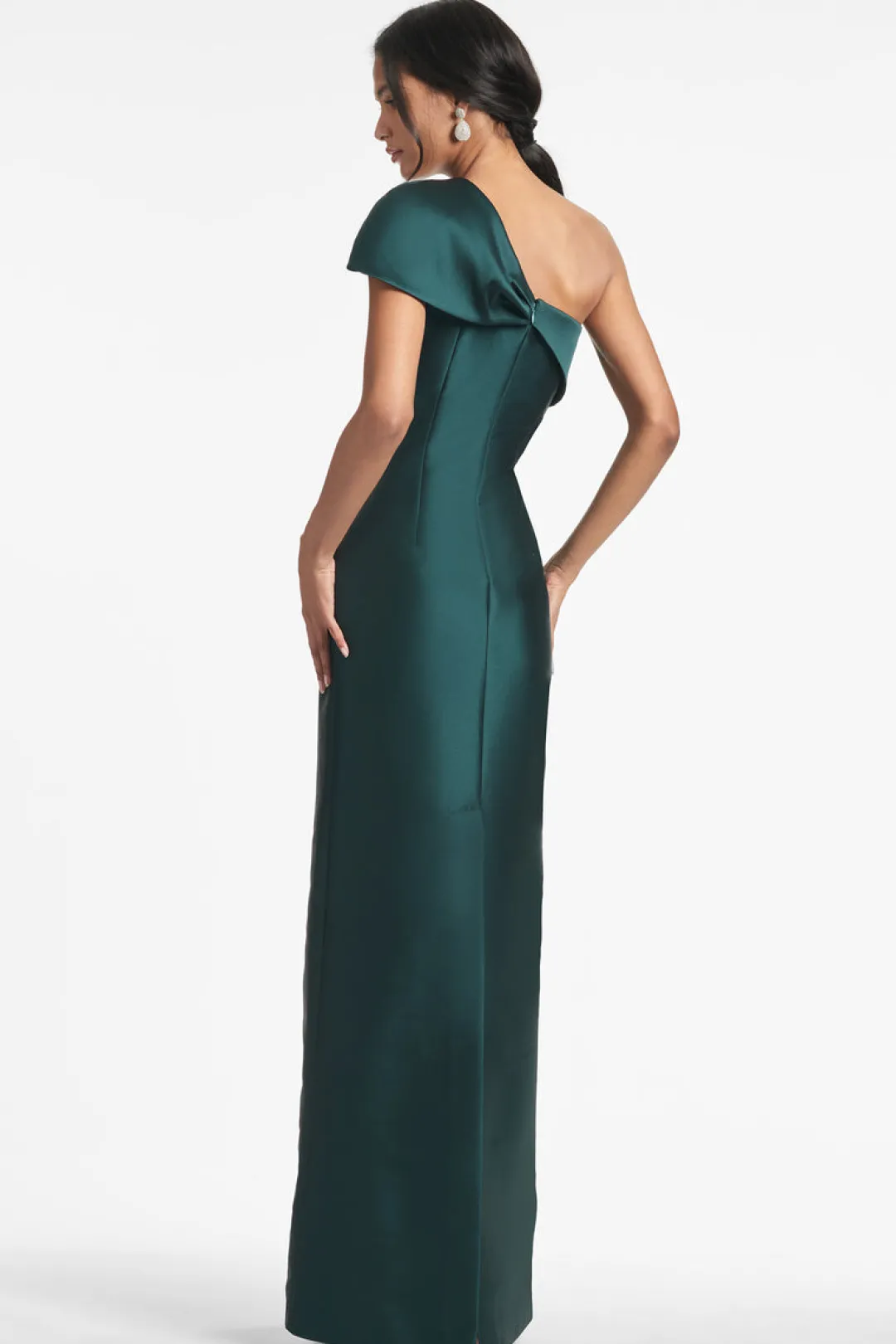 Wrapped in a sleeve of stretch Mikado, the Ines column gown glides over the form to create a clean and subtly sexy silhouette. At one shoulder a swath of Mikado is fashioned into a sculptural sash, adorned with crystals, reminiscent of an heirloom broach.