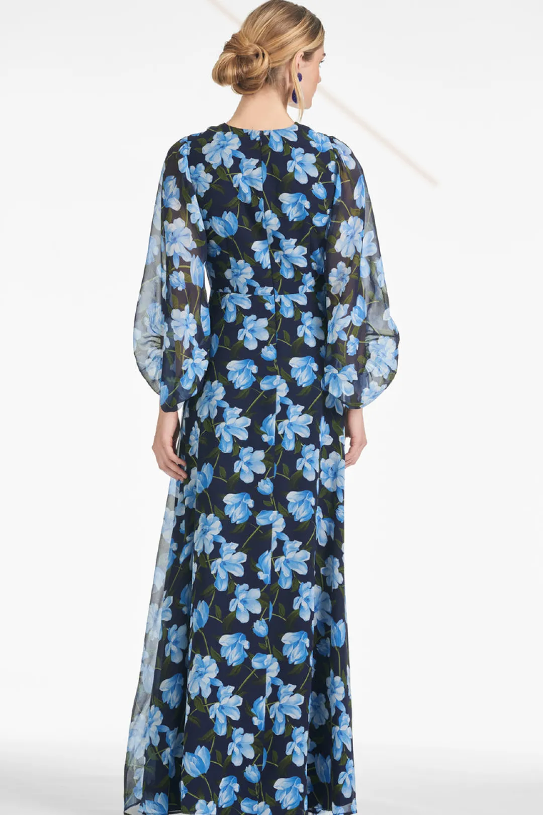 Jenny in Ocean Blue Magnolia is a gown that knows who she is: elegant, understated, and sophisticated. Featured in poly chiffon, the empire waist falls to a perfect A-line while the collapsed crescent sleeves add a subtle yet unique element to the gown’s overall design.