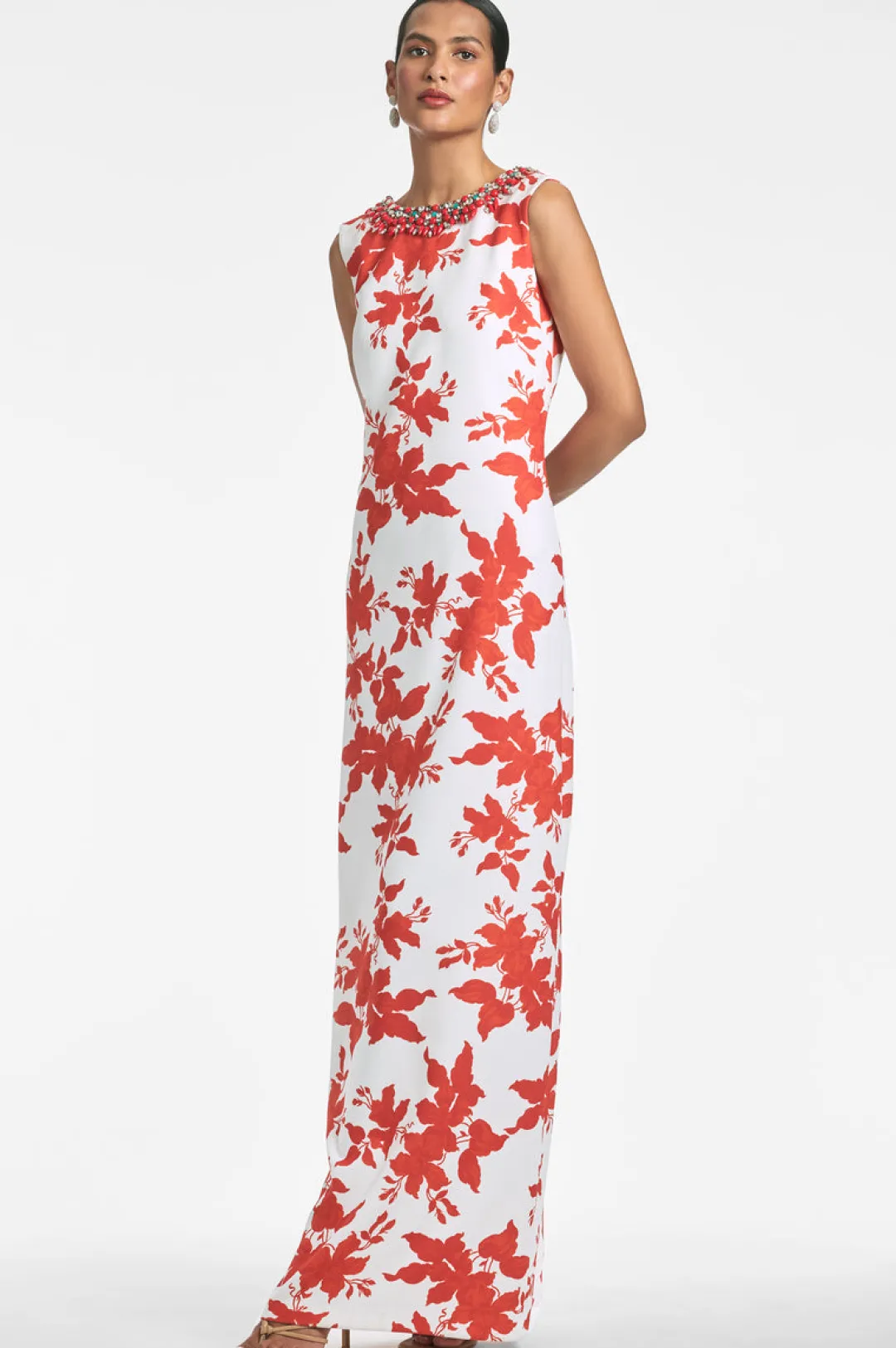 This sophisticated Juliana Gown features a figure-flattering form and an elegant summertime coral narcissus print. The stretch crepe column fit ensures comfort and ease of movement while a captivating bib necklace of faceted crystal, coral and turquoise adds a touch of sparkle.