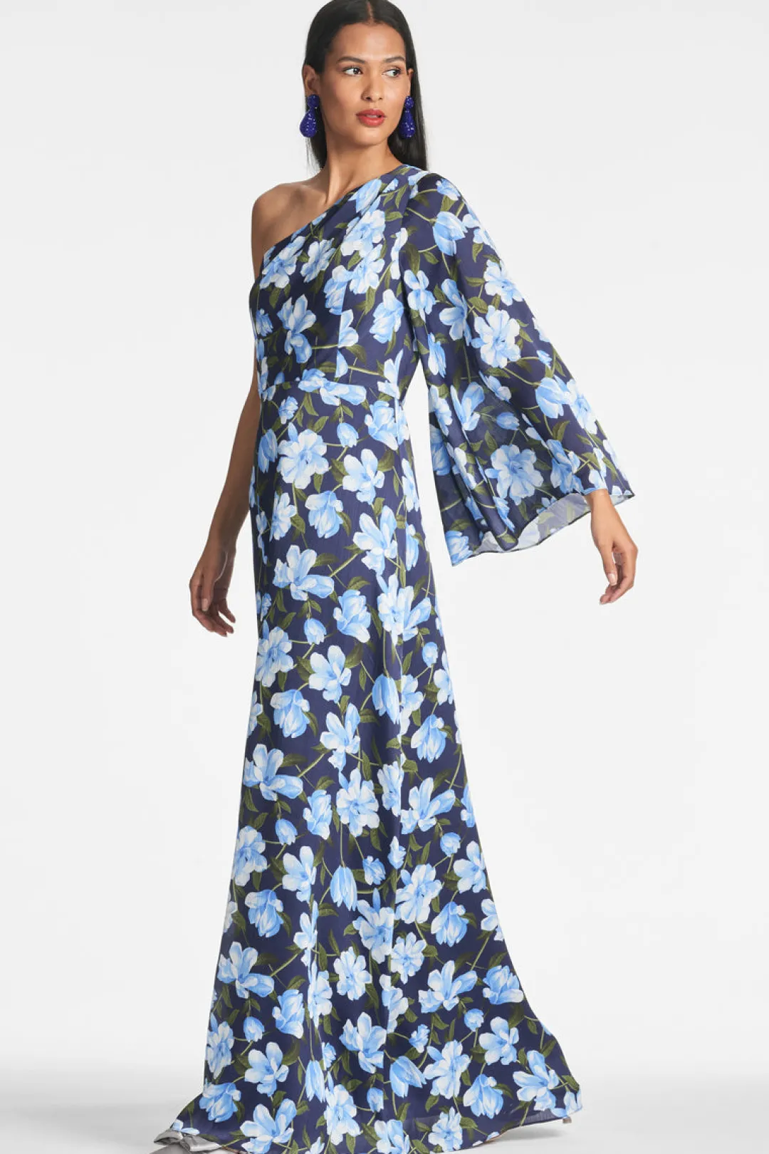 The Keely Gown in Ocean Blue Magnolia is the piece every woman’s closet needs. This one-shoulder silhouette offers coverage, style, and comfort for any event, from gala to wedding. We design all of our dresses in the Essential Social collection with the intention that they can be enjoyed again and again. A timeless dress should be worn often and well.