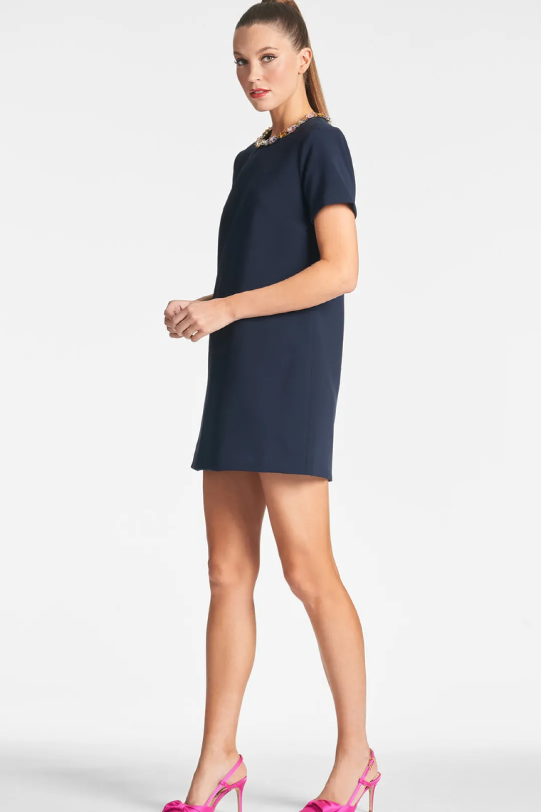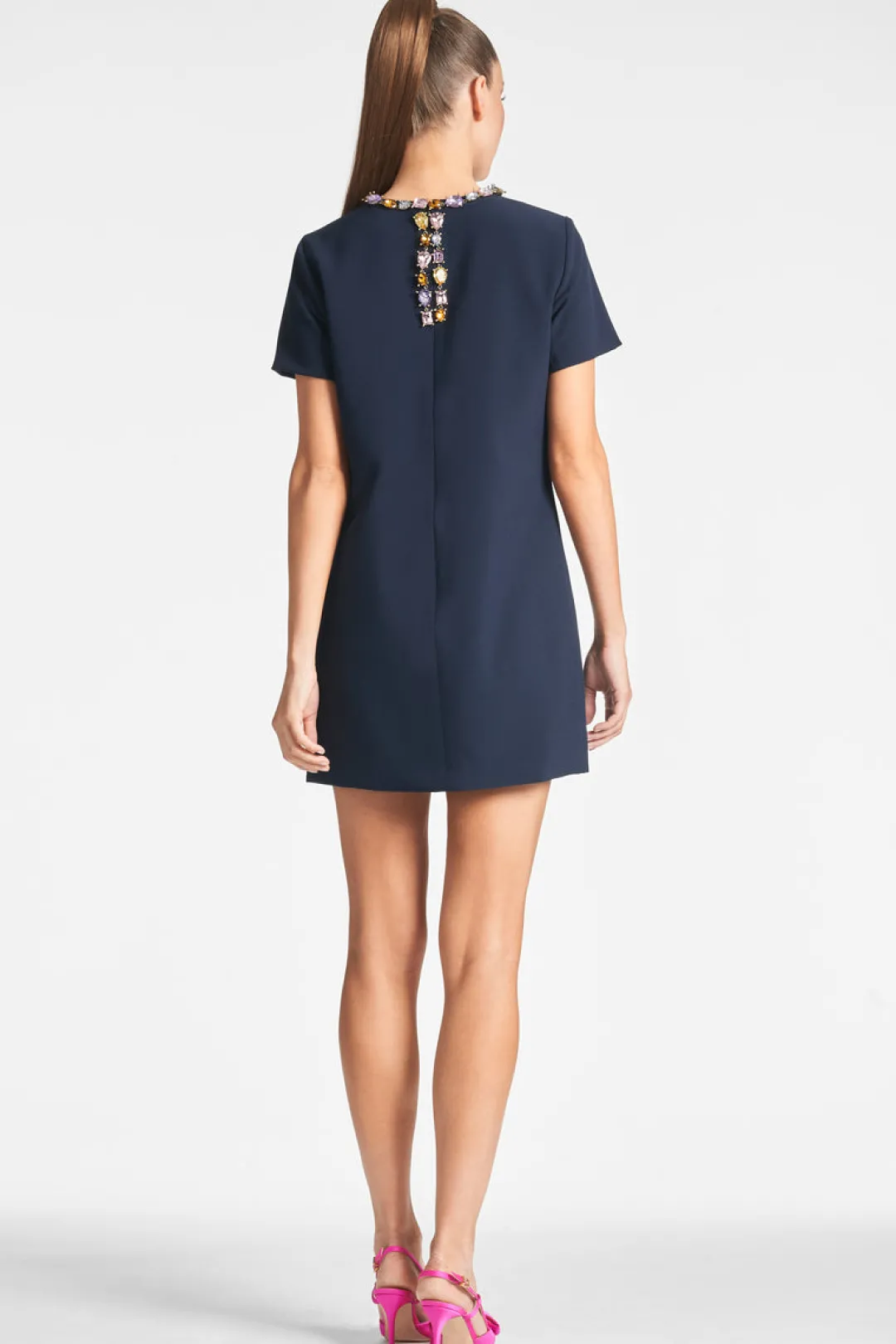 The Lauren Dress in dark midnight is a must have item this season. Crafted from thick stretch crepe, this mini dress features short sleeves and elegant embellishments along the neckline for an eye-catching effect that will make you stand out from the crowd.