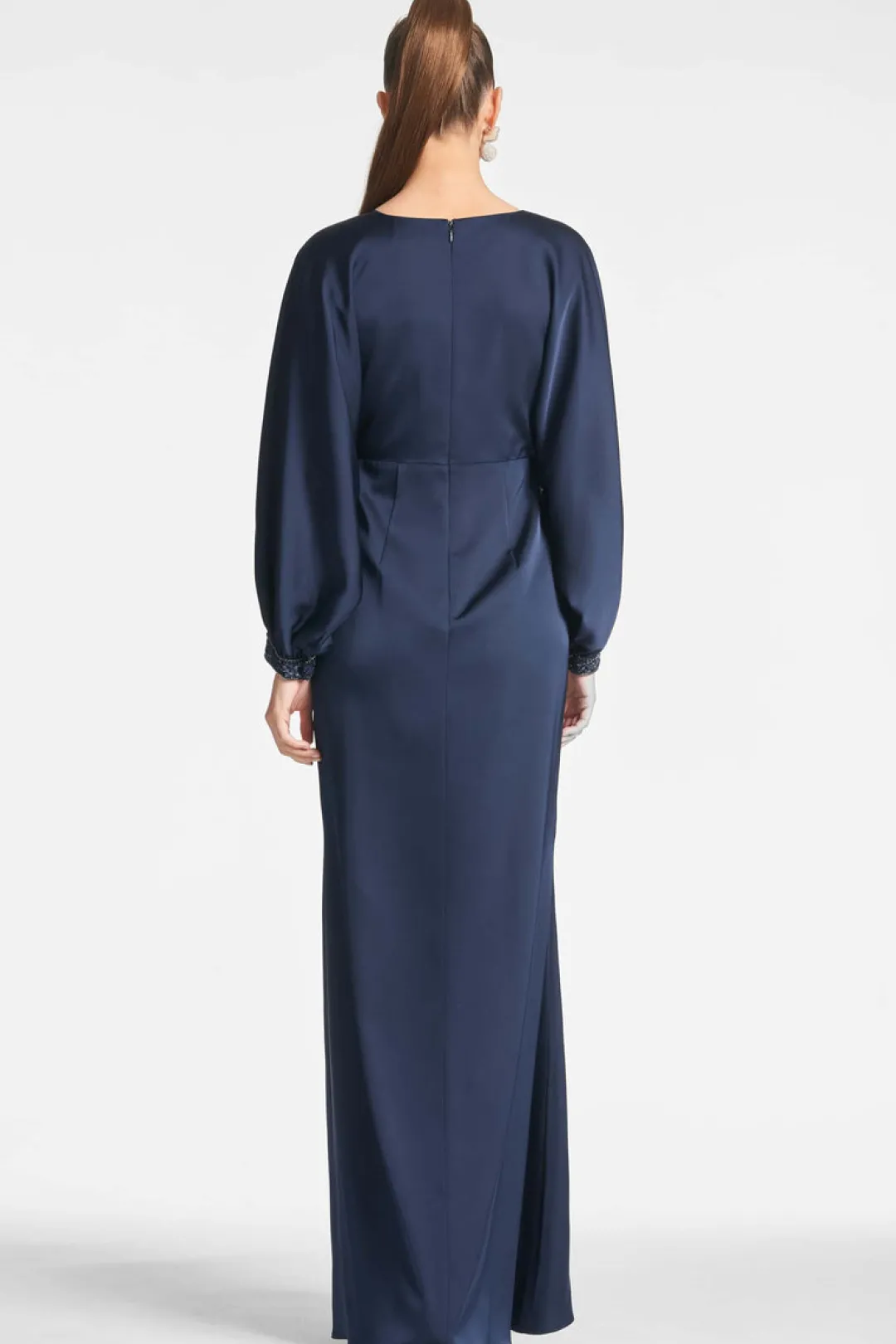 Maia is nothing less than chic, her relaxed silky silhouette definitely gives “Old Hollywood” glamour. Her deep V-neck still has enough coverage to feel appropriate without sacrificing the sultry effect of the gown. What we love is the embellishment at the cuffs, just a little something to set her apart from the crowd.