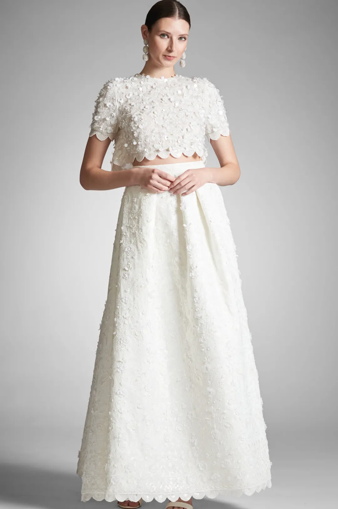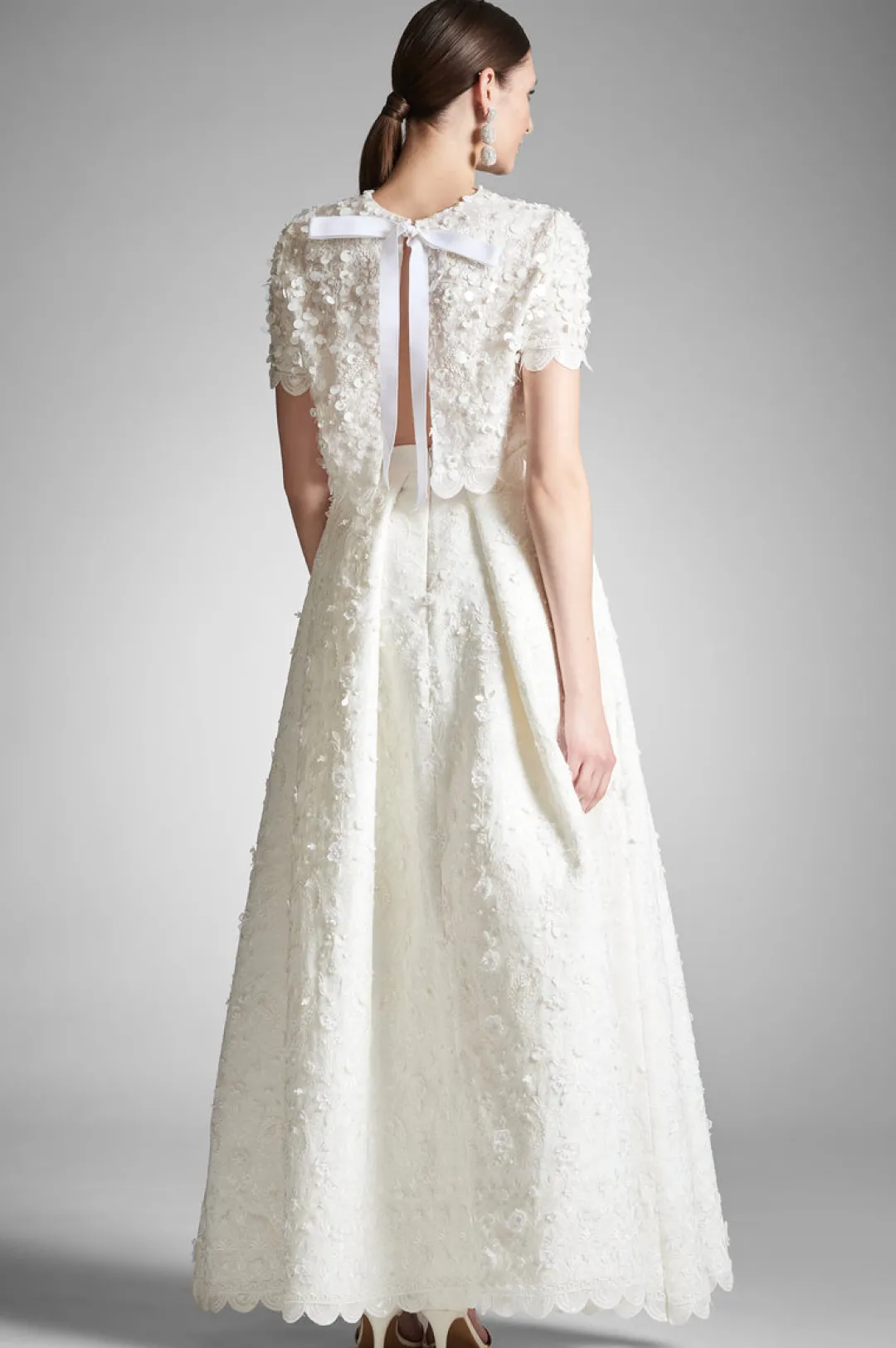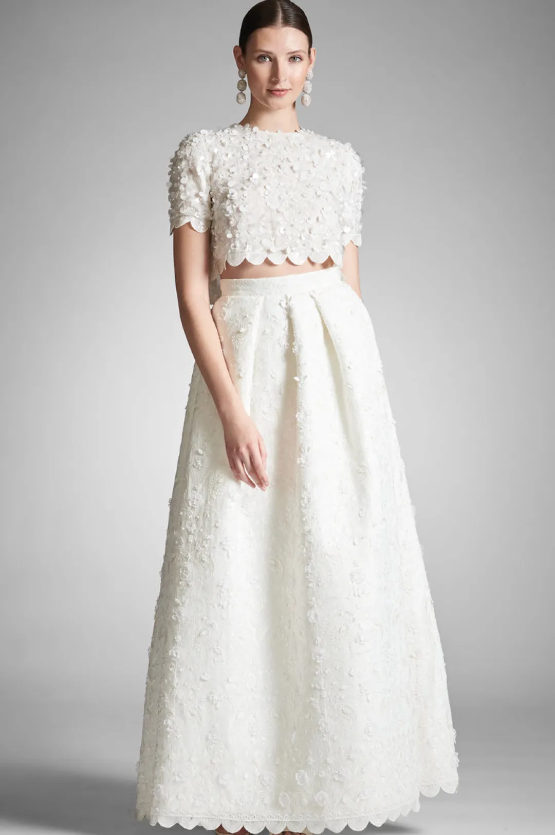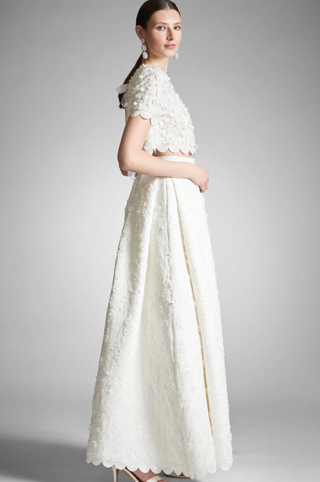 Naya is not for everyone, which is why we only made a select few. The hand embroidered open-back top was designed to be worn back to the magnificent Pyaar ball skirt. This spectacular two piece bridal set features detailed applique throughout for an opulent take on separates. This top gives a romantic feel with short sleeves and a covered front with something to show with an open back. An exquisite choice for any bride.