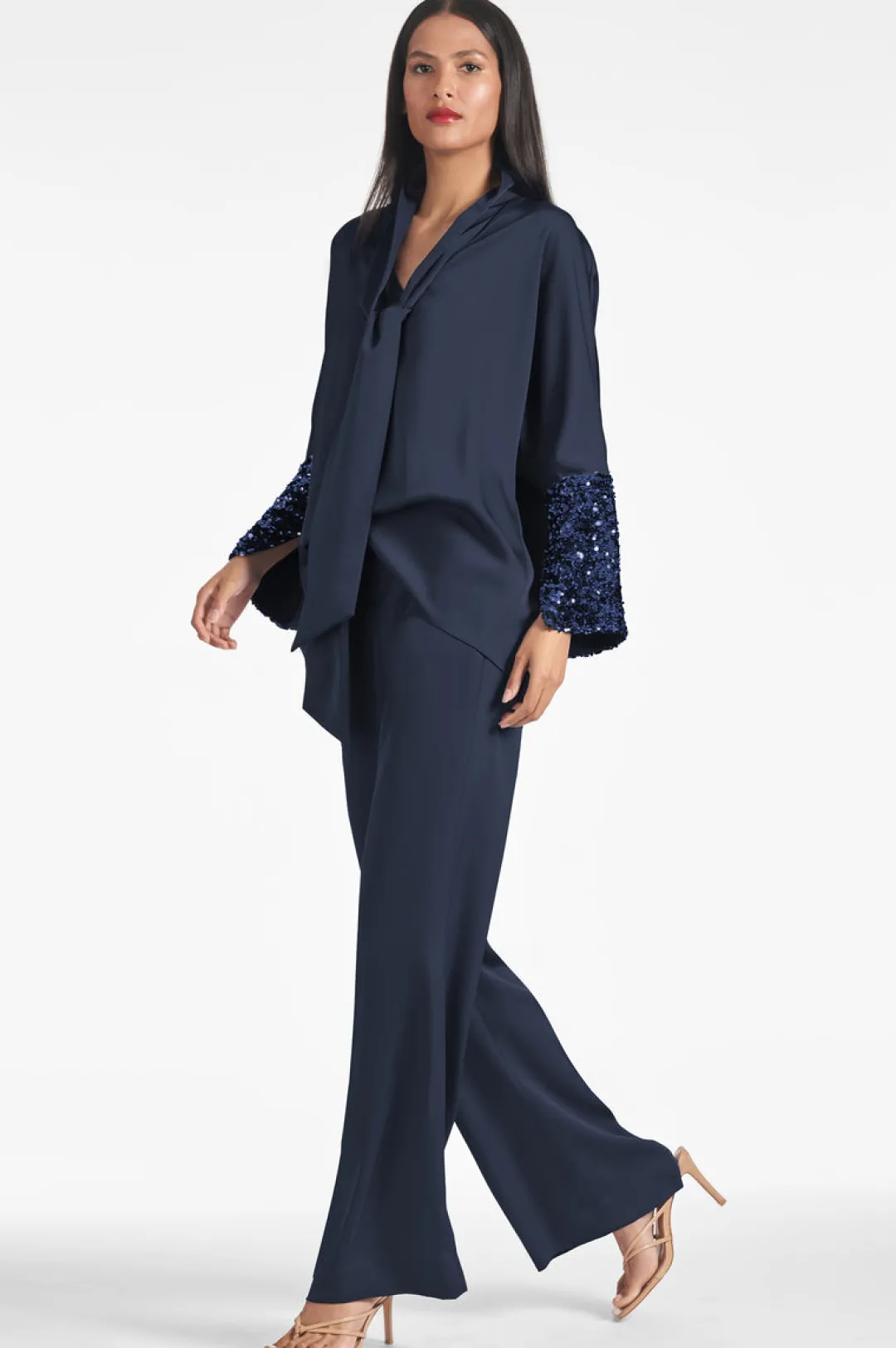 The Reid Top is a stylish, easy-to-wear, relaxed fit statement piece. Perfect for any time of day, from a day at the office to a night out, with a self tie at the neckline and sequin detailing on the sleeve to add that extra shine, Reid is a standout. Pair back to the matching Alli pants or with your favorite jeans or leather.