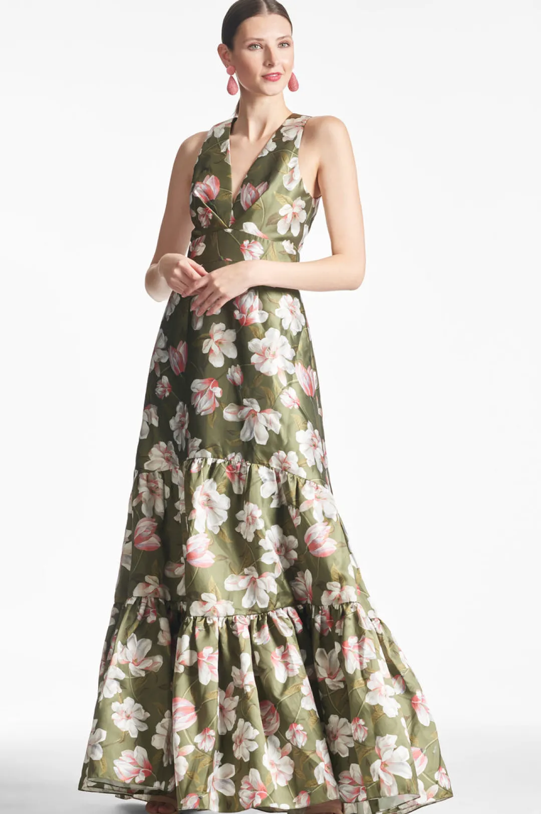 Rori is not for those looking to blend, she is a show-stopping conversation piece. A clean a-line silhouette with deep v-neckline is punctuated through tiers of our moss green magnolia print. Featured in our non-stretch Mikado, she is designed to fit and flatter, cinching at the highest point of the waist and elegantly falling at the hip.