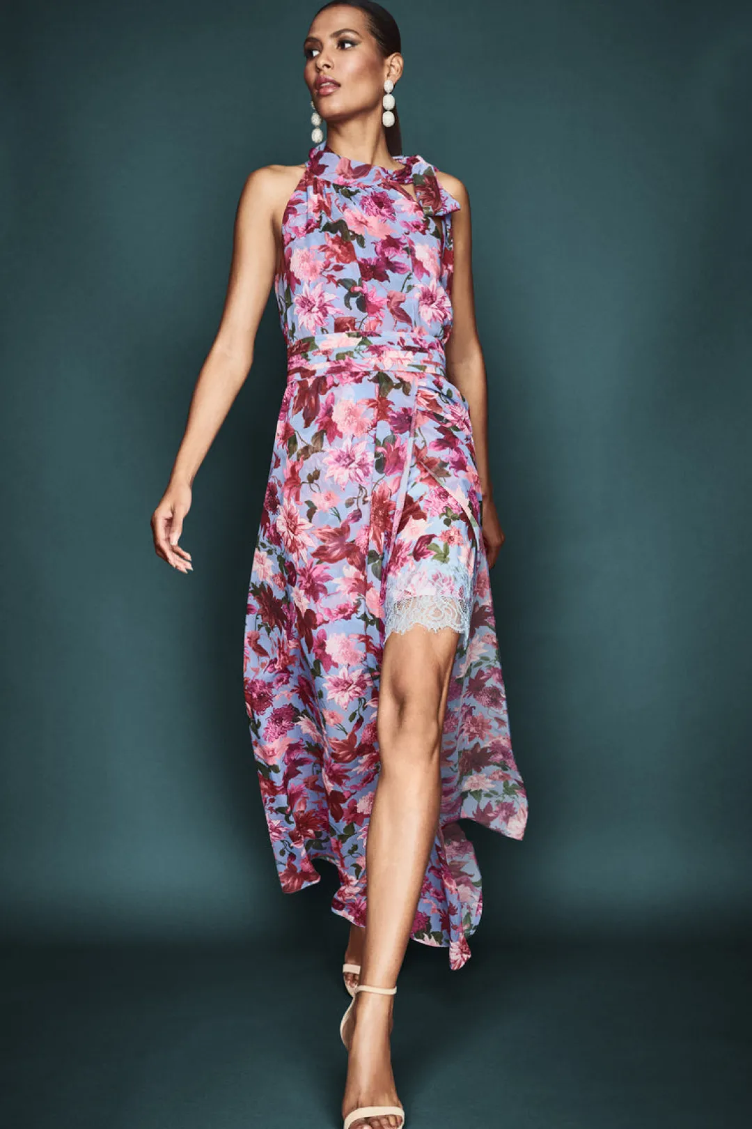 The Selena Dress is the perfect choice for a classic and chic look. Crafted in lightweight chiffon, this dress features a high neckline and a flattering slit, all covered in our pink and periwinkle dahlia print. Elevate any look with this timeless piece.