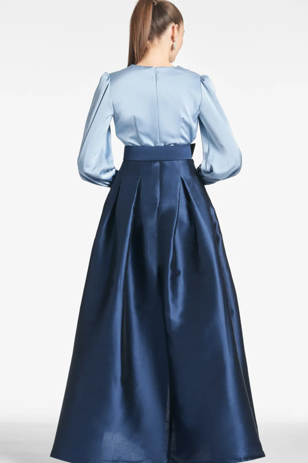 The Zoe Gown is the “Grande Dame” of the occasion. The deep V-neck slate satin crepe bodice meets the printed Mikado self-belt to join the classic ball skirt with its soft, box pleating. At the front a discreet, but still dramatic, front slit and at each side a side slit pockets.